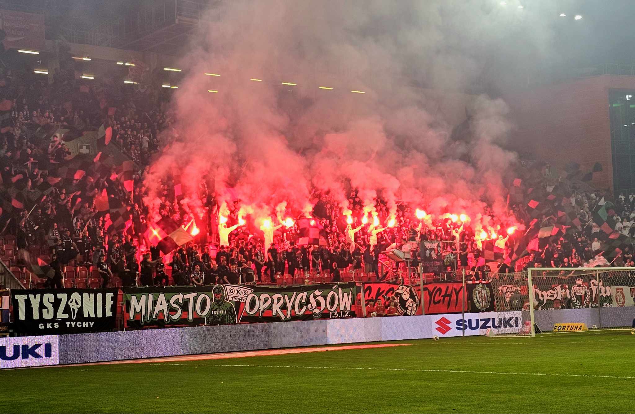 Zbiórka tradycyjnie na ŁKS-ie i w piątkowe popołudnie ruszyliśmy w stronę Górnego Śląska. Droga spokojna na jednym postoju i na kilka minut przed pierwszym gwizdkiem byliśmy na miejscu. Ostatnie osoby na sektor weszły w 25 minucie i wtedy zaznaczyliśmy swoją obecność głośnym „jesteśmy zawsze tam…”. Powiesiliśmy flagę „Troublemakers” oraz flagi z pozdrowieniami dla Łukasza, „Fafluna” i „Mosiona”. Nasza liczba w Gliwicach to 215 osób, w tym 3 ziomków z Zawiszy. W pierwszej połowie w sumie dwukrotnie daliśmy o sobie znać, w tym raz poszedł pocisk w stronę gospodarzy. W drugiej kilka standardowych wyjazdowych wrzutów i to by było na tyle z naszej aktywności wokalnej w Gliwicach. Zresztą w 60 minucie opuściliśmy stadion, gdyż w tym dniu w planach mieliśmy dwa mecze. Udaliśmy się do swoich środków transportu i ruszyliśmy w stronę Tychów, gdzie nasi Bracia grali derby z GKS-em Katowice. Droga szybka i bez przygód a w tym krótkim czasie grajki widząc, że nie mając już bata nad sobą, zagrały „swoje” tracąc 3 bramki i ostatecznie z Gliwic wyjechali z bagażem 4 goli. Przynajmniej nie musieliśmy oglądać kolejnej kompromitacji. Pod stadionem w Tychach byliśmy na kilkanaście minut przed pierwszym gwizdkiem. Rozdanie biletów, wejście i na stadionie stanęliśmy z boku młyna Tyskich, pod naszą flagą „Troublemakers”. Mecz jak mecz, festiwal nienawiści, dobra frekwencja po obu stronach, płonące piro. Aby nie stać w pomeczowych korkach postanowiliśmy na kilka minut przed ostatnim gwizdkiem wyjść ze stadionu. Ruszyliśmy w drogę powrotną. Niedaleko za Tychami złapaliśmy się jeszcze na postoju co by w dalszą drogę ruszyć wspólnie. Powrót przebiegł spokojnie i około 1-wszej zakończyliśmy przedostatni w tym sezonie wyjazd na ŁKS-ie skąd rozjechaliśmy się na swoje rewiry.