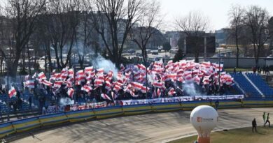 Zbiórka w sobotni poranek tradycyjnie na ŁKS-ie, skąd po jakimś czasie ruszyliśmy w drogę. Ta, mimo że długa, przebiegła spokojnie. Zrobiliśmy jeden dłuższy postój, gdzie złapaliśmy się z naszymi Braćmi z Zawiszy. Tam też dostaliśmy „towarzystwo” milicyjnego helikoptera. Później już za bramkami przed Gdańskiem wąsy wszystkie auta z kibicami kierowały na bok robiąc przy tym swoimi działaniami dodatkowo korek na trasie. Po kilku minutach ruszyliśmy w dalszą drogę. Część osób odbiła jeszcze do Gdyni na jedną z plaż, zaś reszta pojechała już bezpośrednio do Wejherowa. Na miejscu auta były kierowane na jakiś leśny parking. Tam wąsy urządziły wszystkim wjeżdżającym spisywanie. Oczekiwanie na resztę, dojechało też trochę osób, które wyjazd połączyły z wypadem nad morze. Kiedy już wszyscy dojechali na parking, ruszyliśmy w stronę stadionu. Podejście było ciekawe. Kilkusetmetrowy marsz pod górę drogą przez las. Kiedy dotarliśmy pod stadion, mecz już trwał 10 minut. Dowiedzieliśmy się, że jednak wpuszczą tylko 76 osób. Psy wymyśliły sobie mecz podwyższonego ryzyka, zaczęły straszyć miejscowy klub karami jeśli wpuszczą więcej osób, więc Gryf pod naciskiem psiarni zmienił swoją decyzję odnośnie liczby biletów przeznaczonych dla nas. Próby negocjacji były nieudane, więc wiadomo że wchodzimy wszyscy albo nikt i zostaliśmy pod stadionem. Stamtąd widok na murawę był słaby. Widoczna tylko jedna bramka na którą akurat w 1 połowie atakowali gospodarze. Słychać było jedynie doping miejscowych, którzy cisnęli psom, którzy stali za tym, że nas nie wpuścili. My ograniczyliśmy się do kilku standardowych okrzyków, zaś w przerwie meczu zapadła decyzja, że zawijamy się w drogę powrotną. Marsz powrotny, tym razem w dół do naszych aut. Tam wąsy stwierdziły, że wypuszczą nas dopiero jak skończy się mecz. Na szczęście po kilkunastu minutach poszły po rozum do głowy i zaczęliśmy stamtąd wyjeżdżać. Część osób postanowiła jeszcze zostać nad morzem, a reszta powroty miała spokojne i bez przygód.