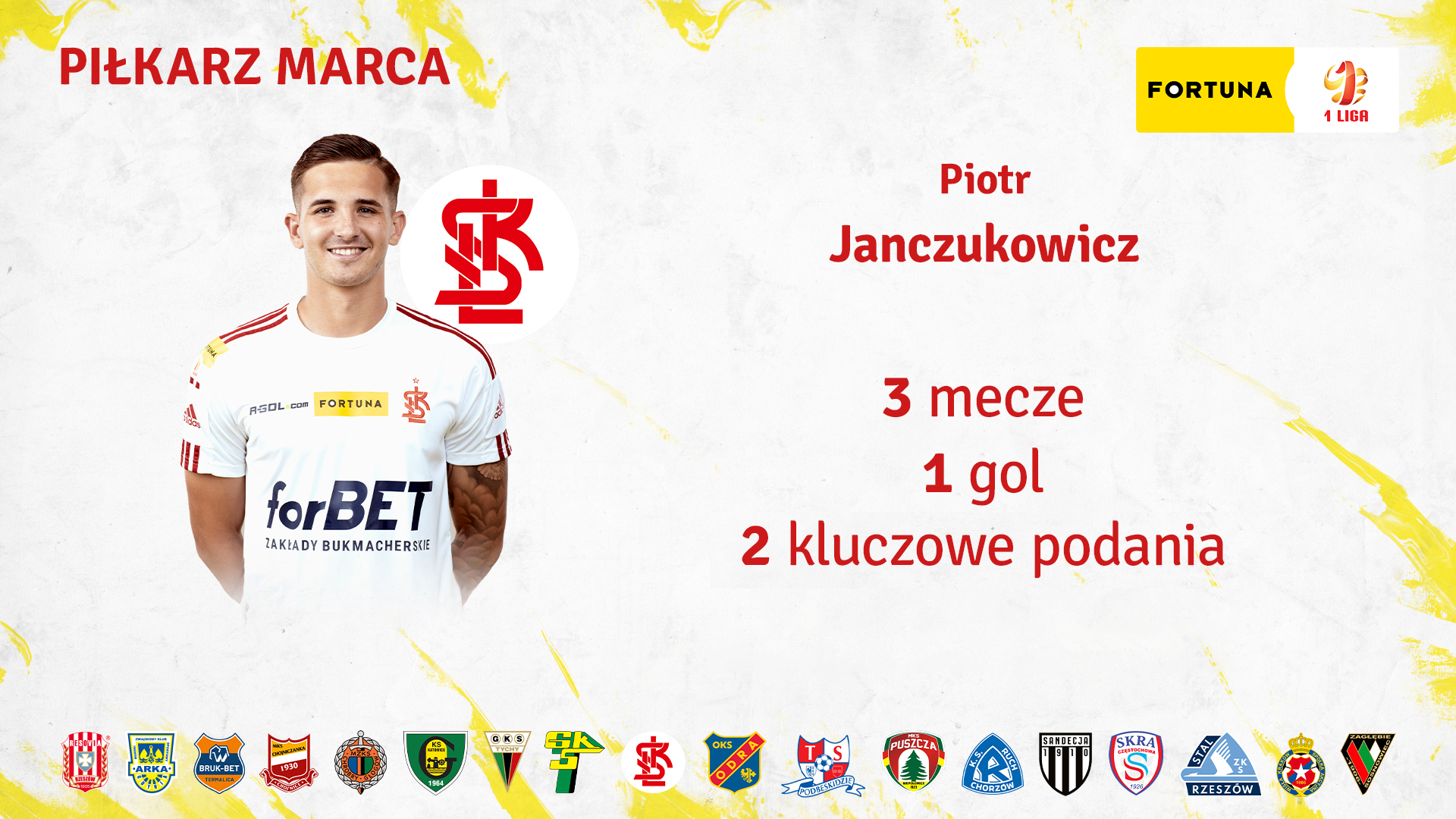Piotr Janczukowicz ma szansę zgarnąć nagrodę dla najlepszego piłkarza marca w Fortuna 1. lidze. Napastnik biało-czerwono-białych w tym miesiącu, pokazał się z dobrej strony. Miał duży wkład w zdobycie kompletu punktów w starciu ze Stalą Rzeszów, a także trafił do siatki w szlagierowym meczu z Ruchem Chorzów.