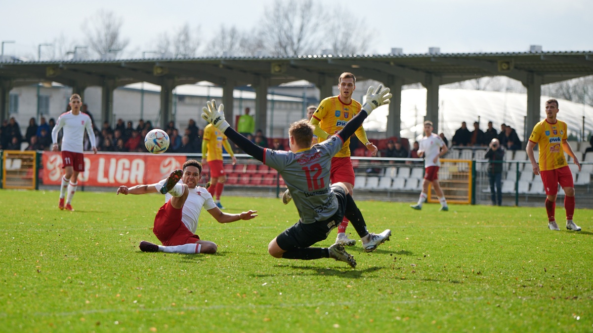 W sobotnim starciu z wiceliderem trener Marcin Matysiak miał do dyspozycji kilku zawodników pierwszego zespołu, którzy ostatnio albo pojawiali się na pierwszoligowych boiskach ciut rzadziej, albo – jak Litwin Artemijus Tutyskinas – wracali do zdrowia po kontuzji. Nie zabrakło też Kazimierza Moskala, który wraz z kibicami pierwszego gola dla gospodarzy doczekał się w 20. minucie – po prostopadłym podaniu do Nelsona Balongo i próbie wślizgu tego ostatniego, piłka odbiła się od bramkarza, po czym na osiemnastym metrze dopadł do niej Maciej Śliwa i technicznym strzałem otworzył wynik spotkania (1:0).