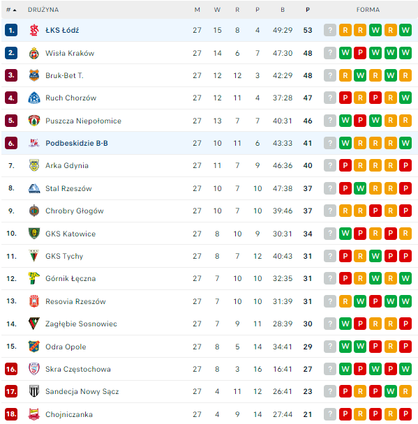 Tabela po 27. kolejkach Fortuna 1. ligi