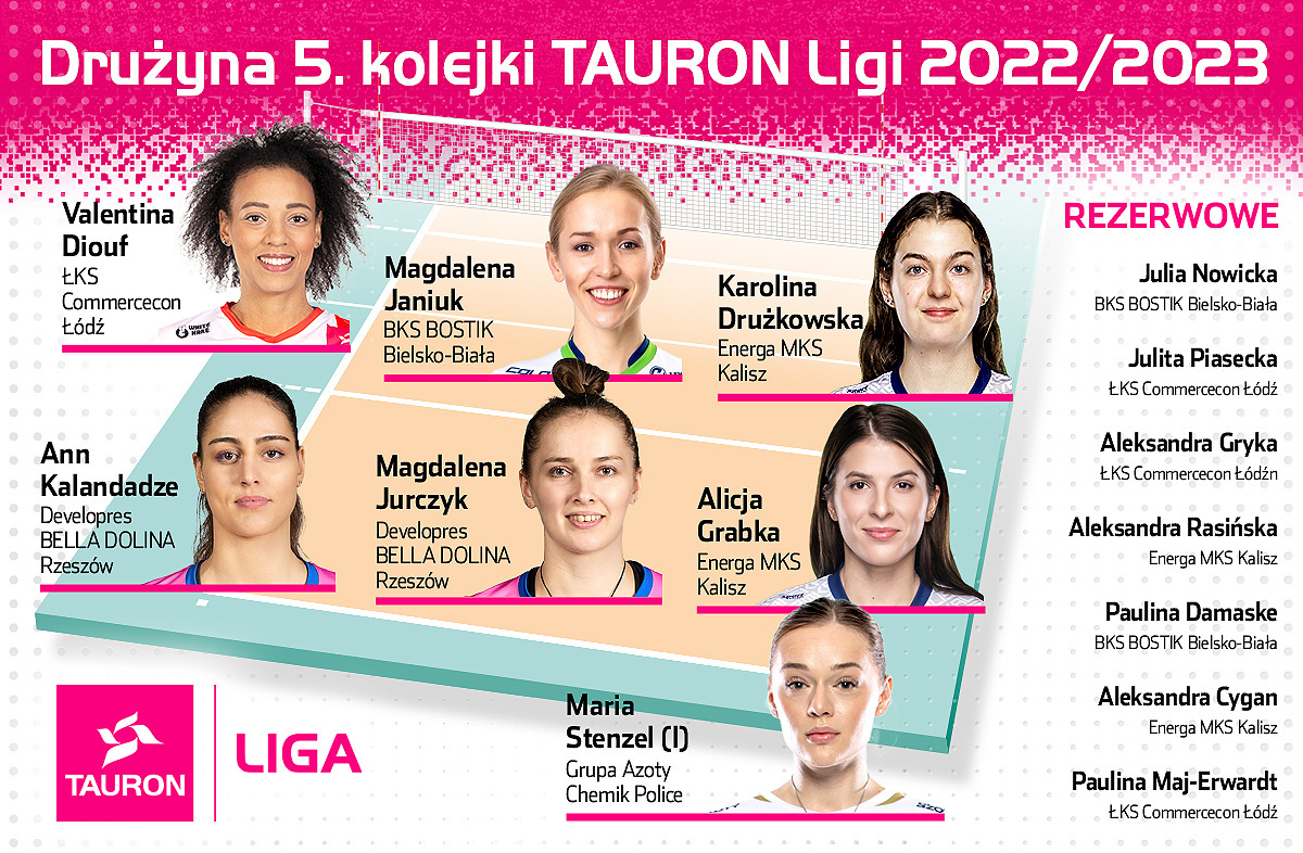 Aż cztery siatkarki ŁKS-u Commercecon Łódź po meczu z #VolleyWrocław znalazły uznanie w oczach redaktorów oficjalnego portalu Tauron Ligi. W pierwszej drużynie 5. kolejki znalazła się Valentina Diouf, a trzy kolejne zawodniczki uplasowały się na ławce rezerwowych.
